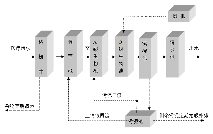 綜合以上考慮醫(yī)院污水處理設(shè)備處理醫(yī)院污水時擬用低能耗的厭氧水解+生物接觸氧化法為主體。通過厭、好氧菌分解有機(jī)物達(dá)到降解去除醫(yī)院綜合污水中有機(jī)污染物質(zhì)與有害、有毒物質(zhì),達(dá)到《醫(yī)療機(jī)構(gòu)水污染物排放標(biāo)準(zhǔn)》(GB18466-2005)一級排放標(biāo)準(zhǔn),出水再經(jīng)過深度處理徹底消毒處理,達(dá)到消滅病菌、細(xì)菌、保障人體健康,消除有機(jī)污染物所引起的污染隱患的目的。